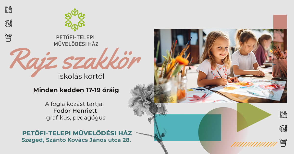 Csatlakozz hozzám és fedezd fel a benned szunnyadó kreativitást a szeptember 3-án induló, keddenkénti rajz szakkörön a szegedi Petőfitelepi Művelődési Házban! Minden eszköz adott, hogy kikapcsolódj, fejleszd a rajzkészséged, varázslatos képeket fess, megismerj újabb és újabb technikákat! A csoporthoz később is csatlakozhatsz, de gyere minél előbb, hogy ne maradj le semmiről!